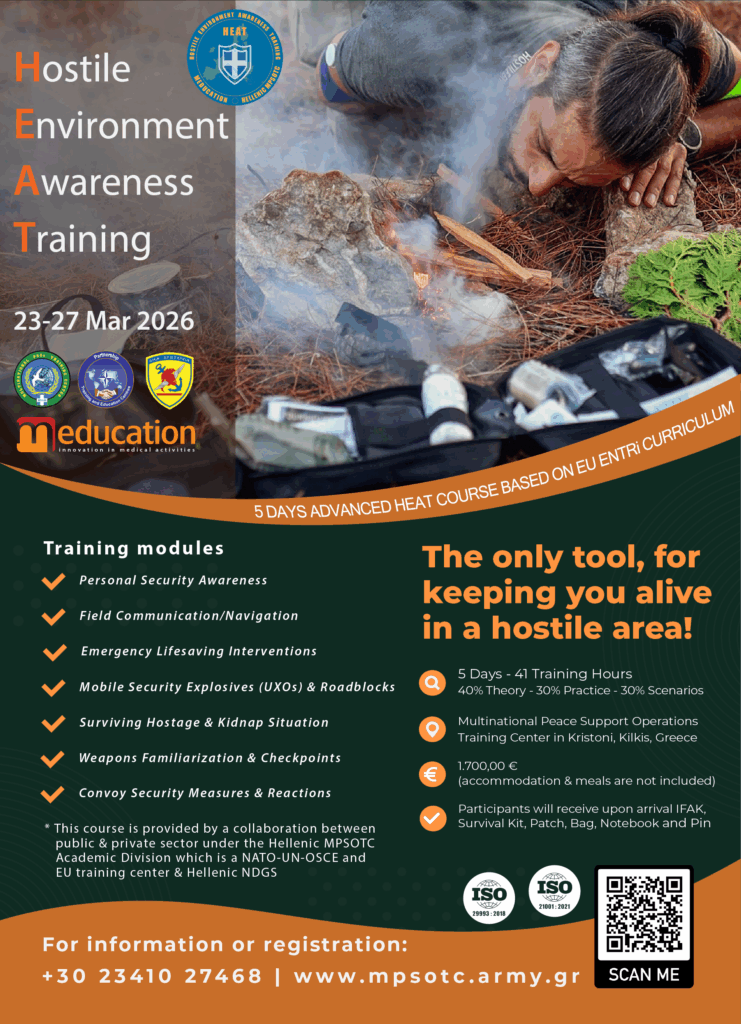 The Hellenic MPSOTC, within the framework of its ongoing and successful collaboration with Meducation – International Medical and Training Institute, announces the organization of the 6th “Hostile Environment Awareness Training (HEAT) School”, which will take place from 23 to 27 March 2026 and emanate from Europe’s New Training Initiative for Civilian Crisis Management (EU ENTRi). […]