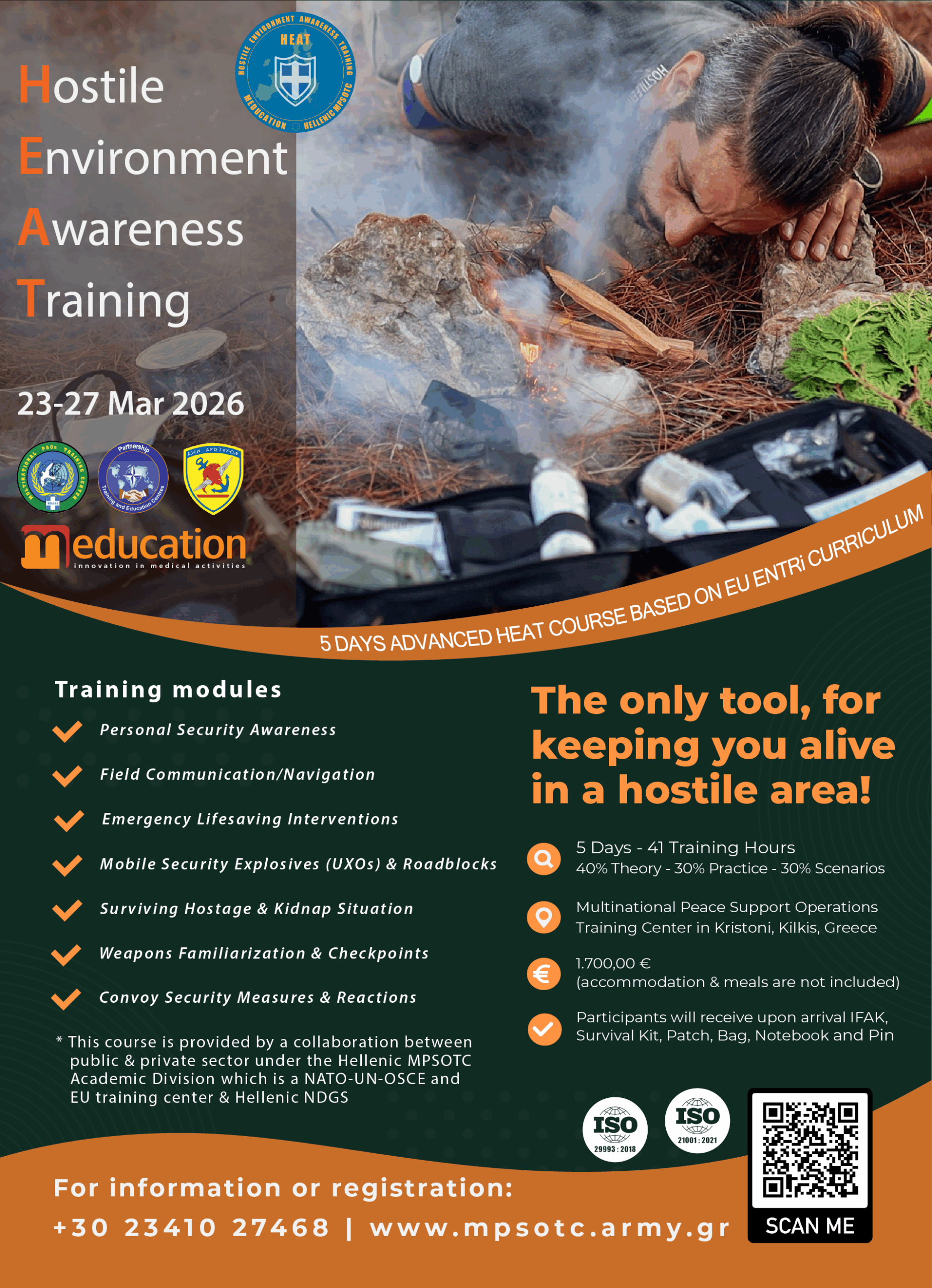 The Hellenic MPSOTC, within the framework of its ongoing and successful collaboration with Meducation – International Medical and Training Institute, announces the organization of the 6th “Hostile Environment Awareness Training (HEAT) School”, which will take place from 23 to 27 March 2026 and emanate from Europe’s New Training Initiative for Civilian Crisis Management (EU ENTRi).